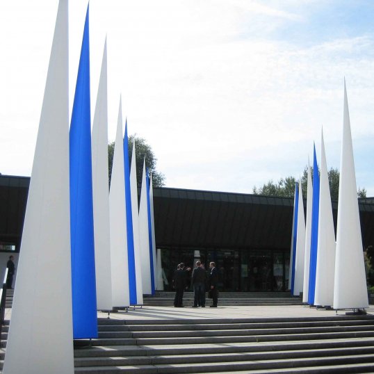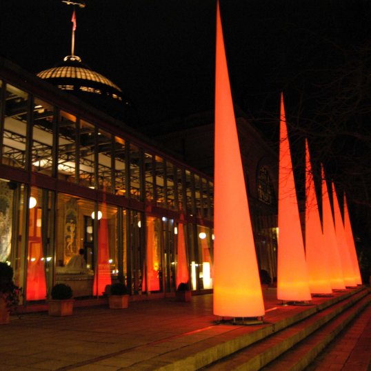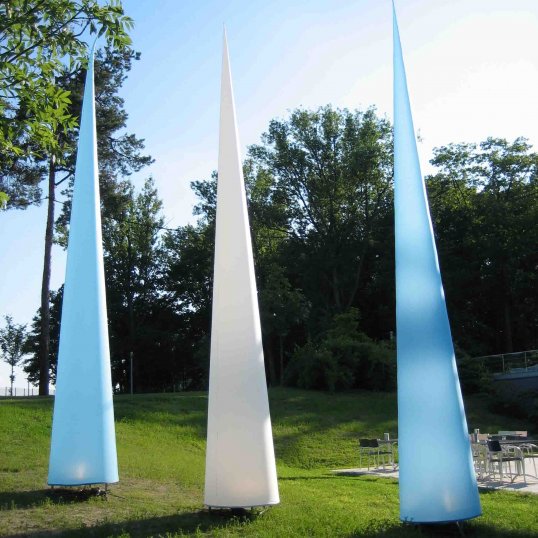 Der integrierte Flüsterventilator richtet die Lichtskulpturen easy cone und easy globe auf. Stromanschluss 230Volt max. 480 Watt (unbeleuchtet, nur Ventilator ca. 30 Watt). In Schutzart IP 44 ausgeführt (Pylonhülle schwer entflammbar nach DIN 4102 B1).