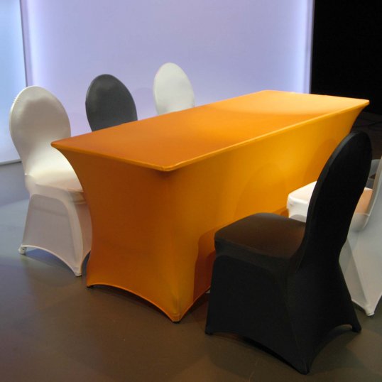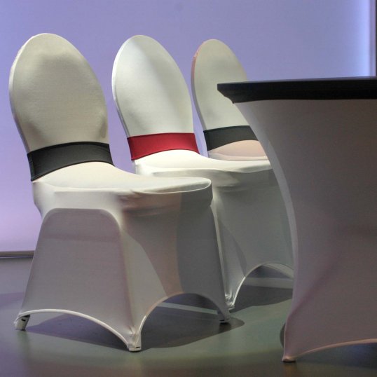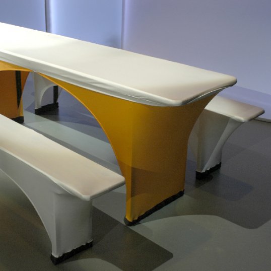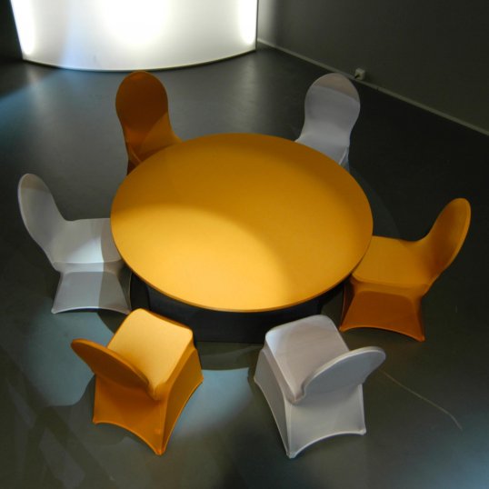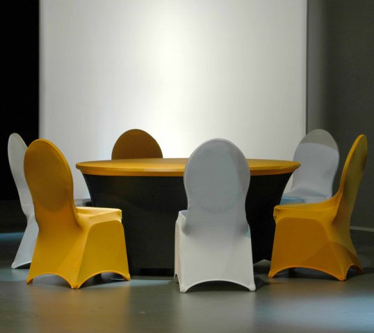 Dineria wird in der Miete als Standardhusse für Banketttische (D 120cm, 150cm und 180cm) angeboten. Bei Kauf wird der Tischbezug nach Mass konfektioniert.