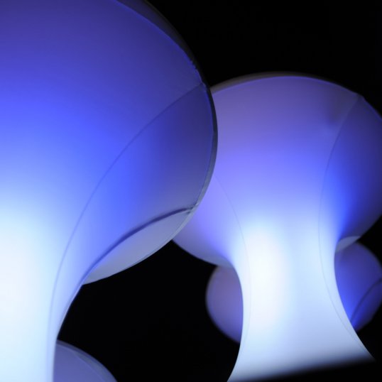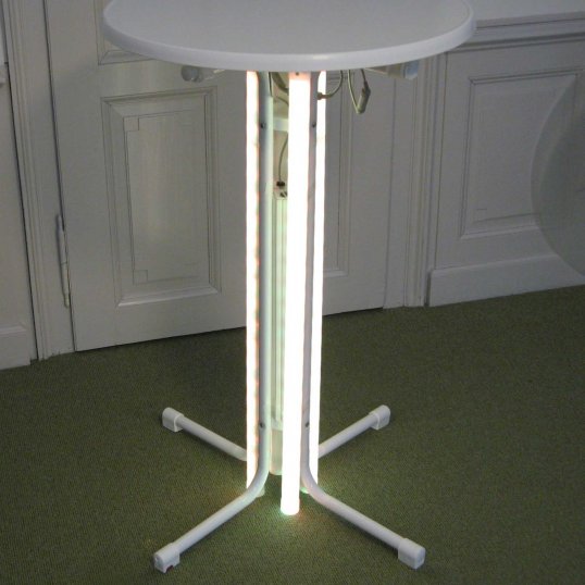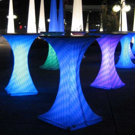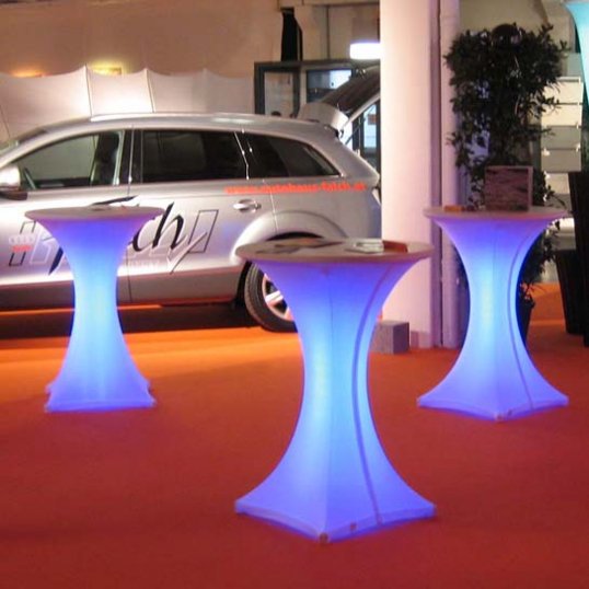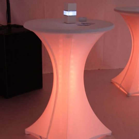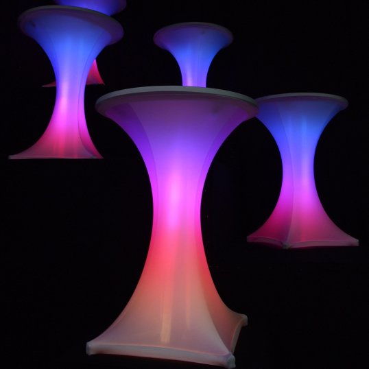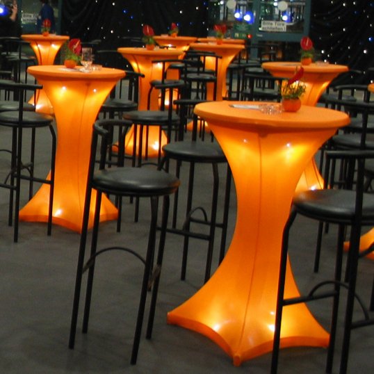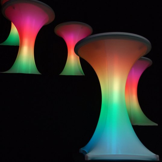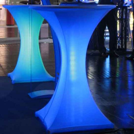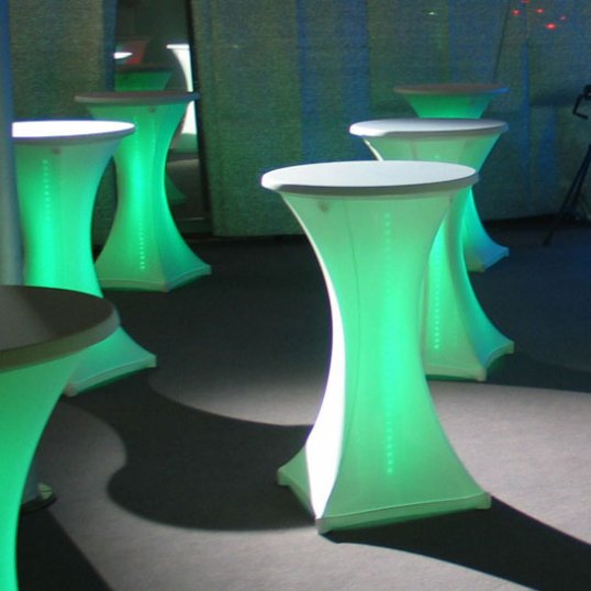 Mit der LED-Beleuchtung können die Stehtischüberzüge effektvoll hinterleuchtet werden. Mittels einer Fernbedienung können Beleuchtungsszenarien und individuelle Farben angesteuert werden.