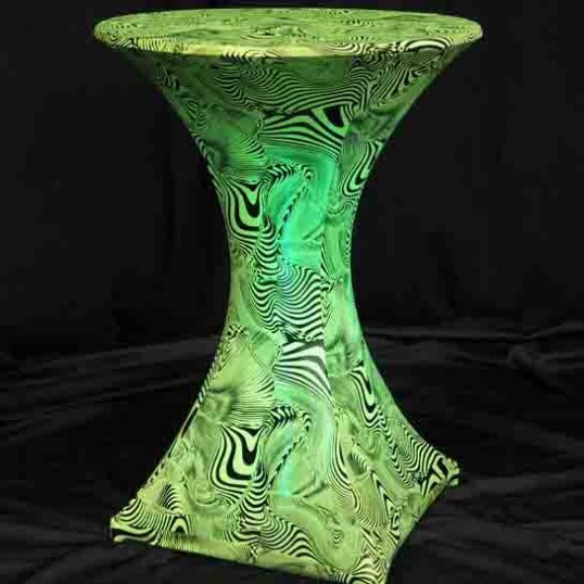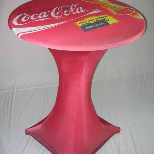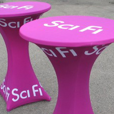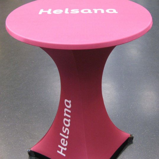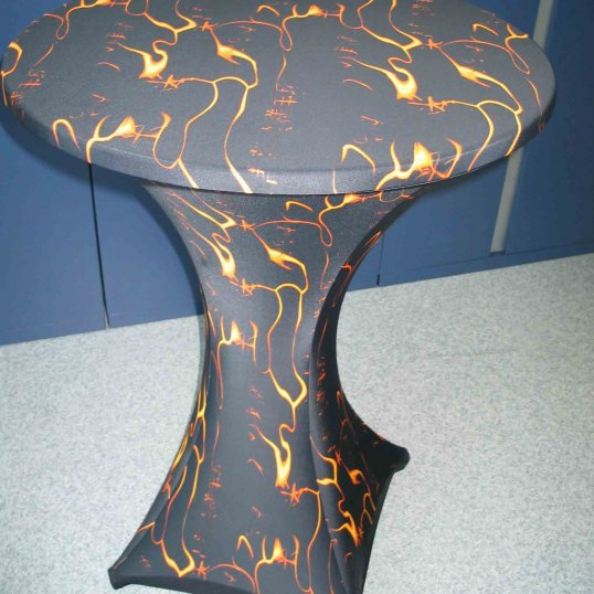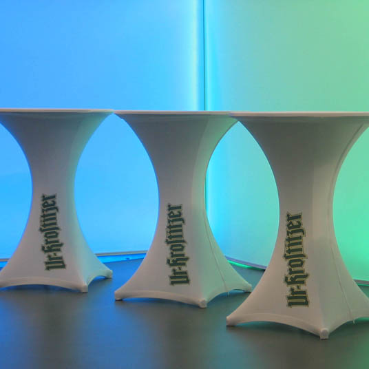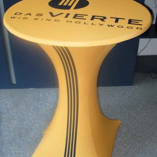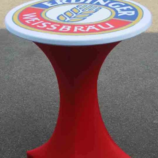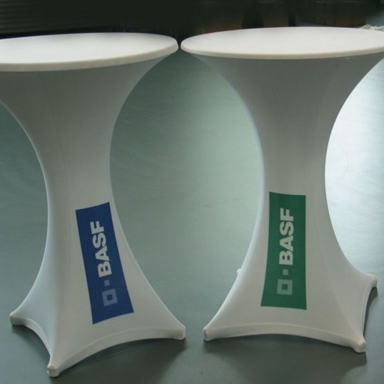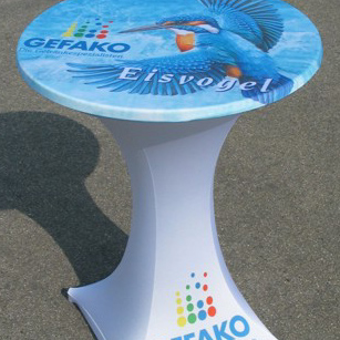 Der Stehtischüberzug ist beim Kauf individuell bedruckbar. Druck eines Logos, eines Schriftzuges oder eines Fotos ist auf der Deckelplatte oder auf den einzelnen Seiten möglich.